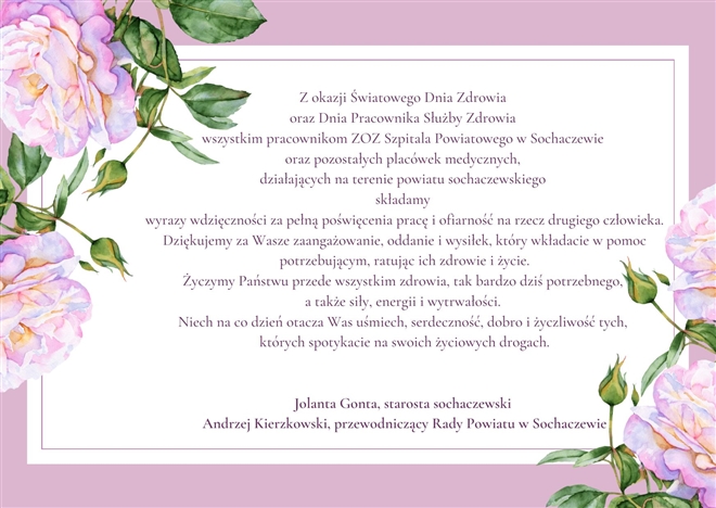 Życzenia z okazji Światowego Dnia Zdrowia oraz Dnia Pracownika Służby Zdrowia od sochaczewskiego samorządu powiatowego