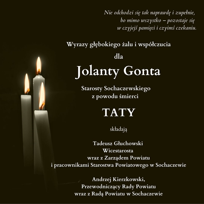Nie odchodzi się tak naprawdę i zupełnie, bo mimo wszystko – pozostaje się w czyjejś pamięci i czyimś czekaniu”. Wyrazy głębokiego żalu i współczucia dla Jolanty Gonta Starosty...