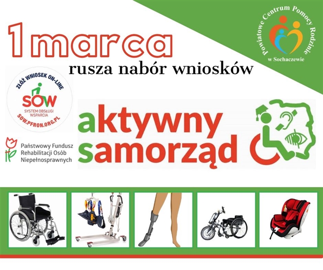 W imieniu Powiatowego Centrum Pomocy Rodzinie w Sochaczew zachęcamy do udziału w programie "Aktywny Samorząd". Wnioski przyjmowane są od 1 marca do 31 sierpnia 2023 r. Szczegóły na plakacie.