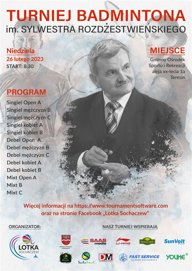 Zachęcamy do udziału w Turnieju Badmintona im. Sylwestra Rozdżestwieńskiego, który odbędzie się 26 lutego w Teresinie w hali Gminnego Ośrodka Sportu i Rekreacji. Start godzina 8.30. Szczegóły na plakacie.