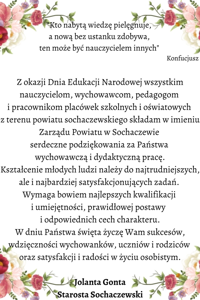 Kto nabytą wiedzę pielęgnuje, a nową bez ustanku zdobywa, ten może być nauczycielem innych. Konfucjusz Z okazji Dnia Edukacji Narodowej wszystkim nauczycielom, wychowawcom, pedagogom i pracownikom placó...
