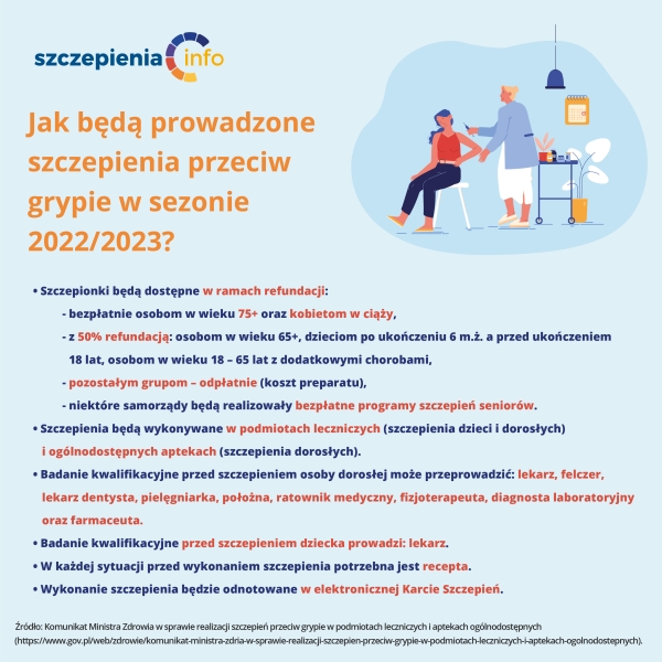 Szczepionki przeciw grypie w sezonie 2022/2023 będą dostępne dla pacjentów w ramach refundacji: bezpłatnie* dla osób w wieku 75+ oraz kobiet w ciąży, - z 50% refundacją dla osób w wieku 65+, - ...