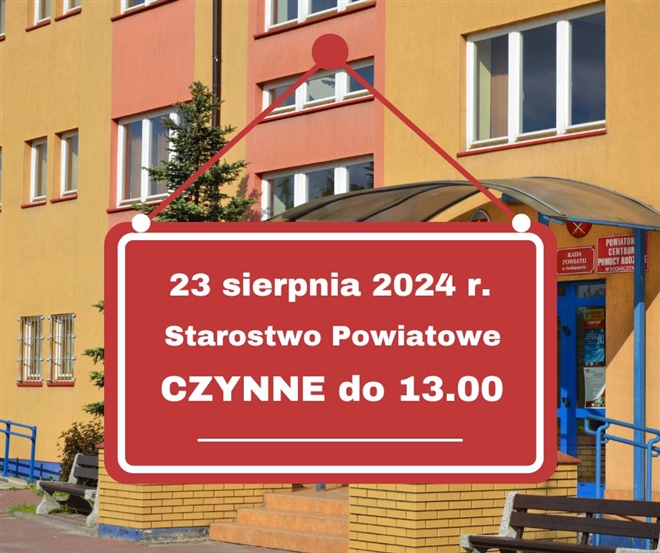 Informujemy, że dziś tj. w piątek, 23 sierpnia br. Starostwo Powiatowe w Sochaczewie (mieszczące się przy ul. marsz. J. Piłsudskiego 65) z przyczyn od nas niezależnych spowodowanych awarią sieci wodno-kanalizacyjnej U...