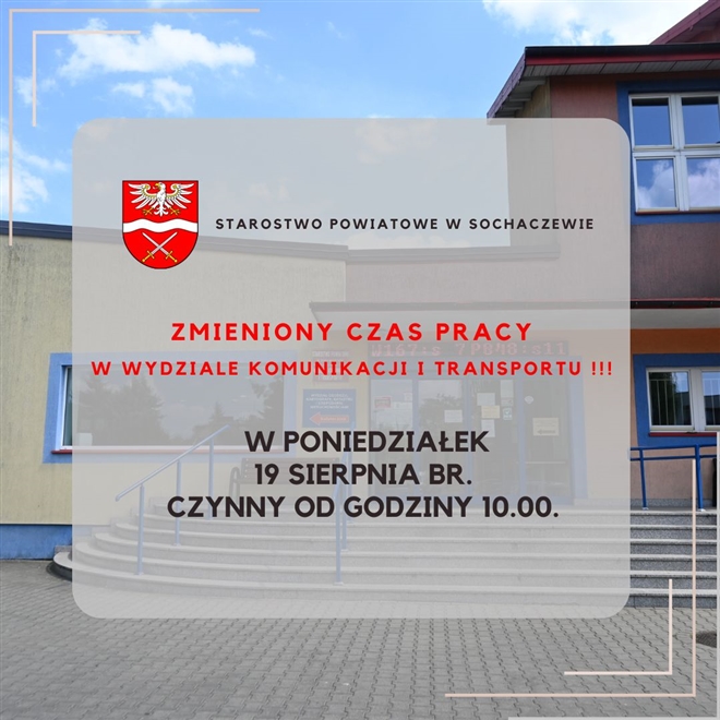 Starostwo Powiatowe w Sochaczewie informuje, iż z przyczyn technicznych Wydział Komunikacji i Transportu w poniedziałek, 19 sierpnia br. będzie czynny od godziny 10.00. Za wszelkie utrudnienia serdecznie przepr...