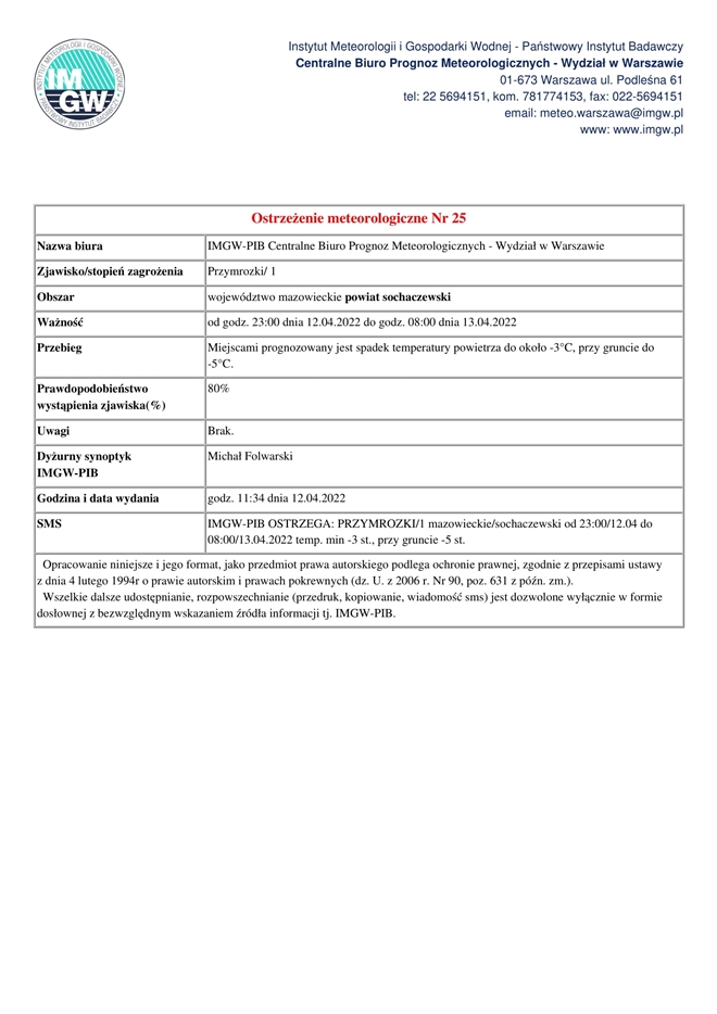 Instytut Meteorologii i Gospodarki Wodnej - Państwowy Instytut Badawczy wydał dla powiatu sochaczewskiego komunikat pogodowy dotyczący ostrzeżenia przed możliwością wystąpienia niebezpiecznych zjawisk atmosferycznych ...