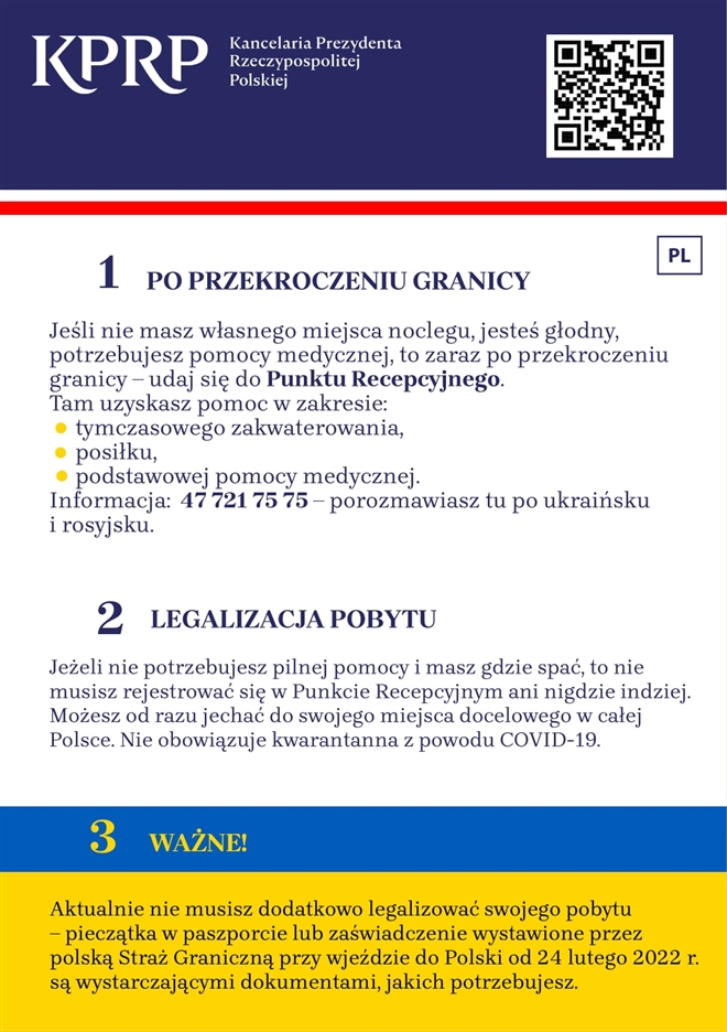 Informacje dla uchodźców wojennych z Ukrainy, którzy przekroczyli granicę Polski. Ulotka ma ułatwić uchodźcom funkcjonowanie w pierwszych godzinach i dniach pobytu w naszym kraju. Kancelaria Prez...
