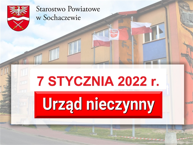 Informujemy, że w piątek, 7 stycznia 2022r. Starostwo Powiatowe w Sochaczewie (mieszczące się przy ul. marsz. J. Piłsudskiego 65) będzie NIECZYNNE. Dzień ten jest dniem wolnym w zamian za święto przypadające w sobotę,...