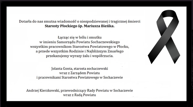 Dotarła do nas smutna wiadomość o niespodziewanej i tragicznej śmierci Starosty Płockiego śp. Mariusza Bieńka. Łącząc się w bólu i smutku w imieniu Samorządu Powiatu Sochaczewskiego wszystkim pracownikom S...