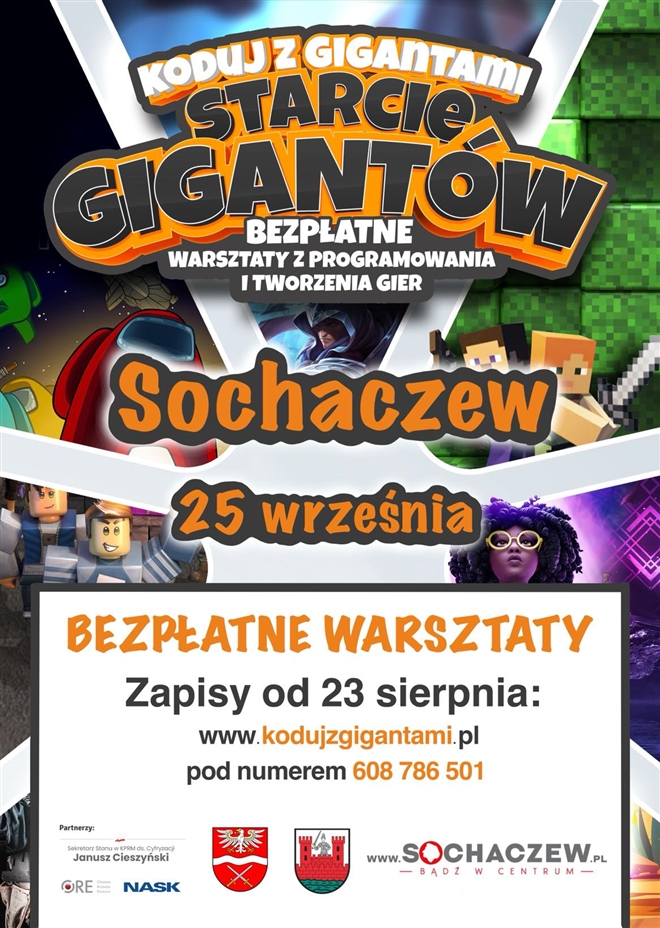 Zapraszamy na bezpłatne warsztaty programowania dla dzieci i młodzieży pt. "Koduj z Gigantami" organizowane pod patronatem Starosty Powiatu Sochaczewskiego oraz Burmistrza Miasta Sochaczewa. Czekamy na dziec...