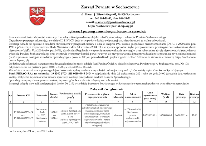 Zarząd Powiatu w Sochaczewie ogłasza przetarg ustny nieograniczony na sprzedać nieruchomości w Sochaczewie dla ogloszenia o przeznaczeniu nieruchomości do psrzedaży nieruchomosci gruntowych w gminie Teresin.