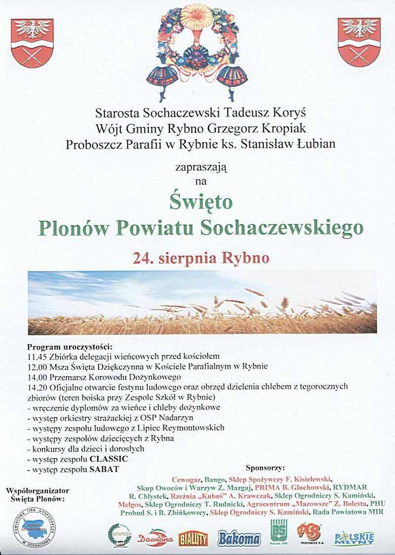Starosta Sochaczewski Tadeusz Koryś, Wójt Gminy Rybno Grzegorz Kropiak, Proboszcz Parafii w Rybnie ks. Stanisław Łubian zapraszają na uroczystość Święta Plonów Powiatu Sochaczewskiego, które w tym roku odbędą się 24. sierpnia w RybnieProgram uroczystości: 11.45 Zbiórka delegacji wieńcowych przed kościołem12.00 Msza Święta Dziękczynna w Kościele Parafialnym w Rybnie14.00 Przemarsz Korowodu Dożynkowego14.20 Oficjalne otwarcie festynu ludowego oraz obrzęd dzielenia chlebem z tegorocznych zbiorów (teren boiska przy Zespole Szkół w Rybnie)- wręczenie dyplomów za wieńce i chleby dożynkowe- występ orkiestry strażackiej z OSP Nadarzyn - występy zespołu ludowego z Lipiec Reymontowskich - występy zespołów dziecięcych z Rybna- konkursy dla dzieci i dorosłych- występ zespołu CLASSIC- występ zespoł...