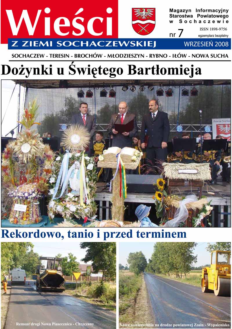 Wracamy po wakacyjnej przerwie z kolejnym, wrześniowym numerem „Wieści z Ziemi Sochaczewskiej”.Już we wtorek znajdziecie Państwo nowe wydanie wraz „Ziemią Sochaczewską”, a od poniedziałku magazyn będzie kolportowany m.in. do Urzędów Gmin, sklepów, ośrodków zdrowia z terenu całego powiatu.W najbliższym numerze przeczytają Państwo m.in.: obszerną relację z naszych Dożynek Powiatowych w Rybnie, i Wojewódzkich, na których byliśmy w Zwoleniu, będzie też o remontach drogowych, piszemy o nowym obliczu sali konferencyjnej Starostwa i planach przeniesienia Wydziału Komunikacji i Transportu.Przeczytają też Państwo o pomocy dla sochaczewskiego szpitala, nowym rankingu samorządów, dotyczącym funkcjonowania administracji, dyrektor ZS CKP a także nagrodzie dla gminy Teresin.Zachęcamy do lektury najnowszego Magazynu Informacyjne...