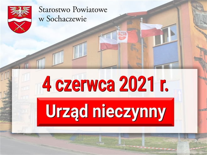 Informujemy, że w piątek, 4 czerwca br. Starostwo Powiatowe w Sochaczewie (mieszczące się przy ul. marsz. J. Piłsudskiego 65) będzie nieczynne. Ponadto, informujemy, iż również w tym dniu nie będą pracować plac...