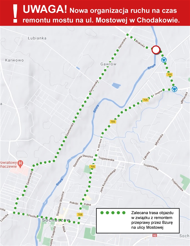 Most na rzece Bzurze zlokalizowany w ciągu ulicy Mostowej w Chodakowie został zamknięty, w związku z rozpoczynającą się rozbudową przeprawy. Na czas zamknięcia odcinka drogi została zmieniona organizacja ruchu i wyzn...