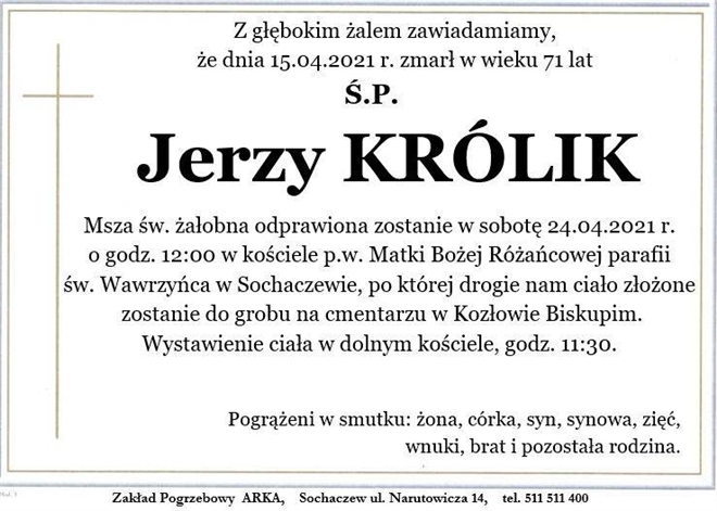15 kwietnia w wieku 71 lat zmarł Jerzy Królik - dyrektor Wydziału Rozwoju, Rolnictwa, Leśnictwa i Ochrony Środowiska w Starostwie Powiatowym w Sochaczewie. Ostatnie pożegnanie odbędzie się w najbliższą sob...