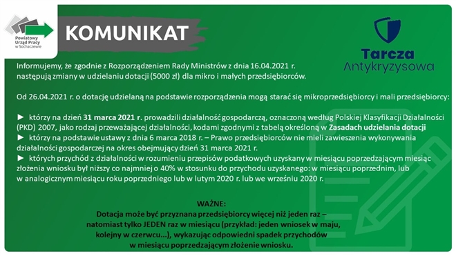 Powiatowy Urząd Pracy w Sochaczewie informuje, iż zgodnie z Rozporządzeniem Rady Ministrów z dnia 16.04.2021 r. następują zmiany w udzielaniu dotacji (5000 zł) dla mikro i małych przedsiębiorców. ...