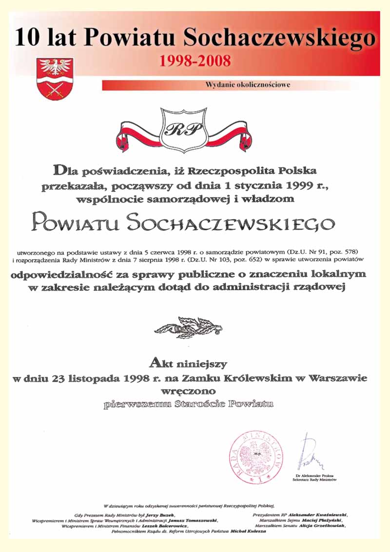 Starosta Sochaczewski Tadeusz Koryś i Przewodniczący Rady Powiatu Andrzej Grabarek zapraszają na uroczystości z okazji 90. Rocznicy Odzyskania Niepodległości oraz 10-lecia Powiatu Sochaczewskiego.11. listopada 2008 r.Godz. 12.30 – Msza Św. Za Ojczyznę i Samorząd Powiatowy w kościele parafii św. Wawrzyńca p.w. Matki Bożej Różańcowej w SochaczewieGodz. 15.00 – Uroczysta Sesja Rady Powiatu – Państwowa Szkoła Muzyczna I i II st. w Sochaczewie, ul. Głowackiego 2:- otwarcie obrad sesji- wystąpienie starosty sochaczewskiego- inscenizacja słowno-muzyczna pt. : „Żeby Polska była Polską” w wykonaniu uczniów Zespołu Szkół Ogólnokształcących im. F. Chopina w Sochaczewie- referat regionalisty Aleksandra Grzegorza Turczyka pt. : „Włodzimierz Garbolewski – pierwszy starosta sochaczewski – działacz społeczn...