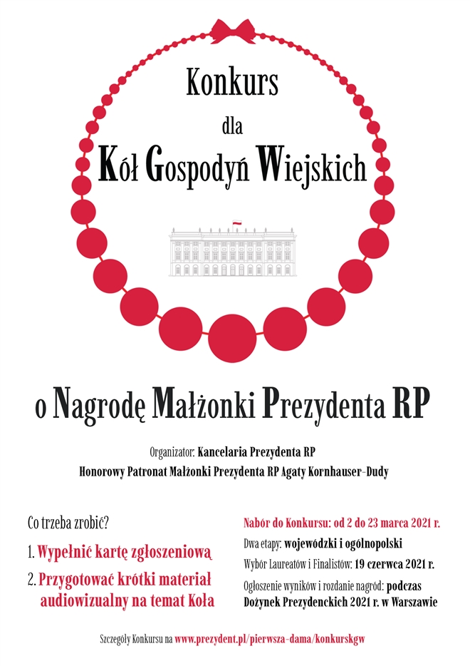 Kancelaria Prezydenta RP ogłosiła konkurs dla kół gospodyń wiejskich. Wydarzenie jest inicjatywą małżonki Prezydenta RP Agaty Kornhauser-Dudy i jest objęte jej Honorowym Patronatem. Adresowane jest do KGW z cał...