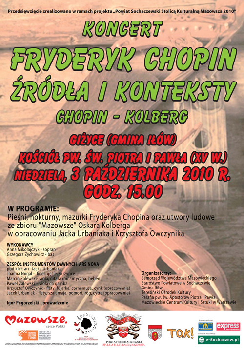 Powiat Sochaczewski Stolicą Kulturalną Mazowsza 20102010 Rok Fryderyka ChopinaZAPRASZAMY NA KONCERTFRYDERYK CHOPIN – ŹRÓDŁA I KONTEKSTYCHOPIN-KOLBERGGiżyce (Gmina Iłów)Kościół pw. św. Piotra i Pawła (XV w.)Niedziela, 3 października 2010 godz. 15.00WYKONAWCY Anna Mikołajczyk - sopranGrzegorz Zychowicz - bas ZESPÓŁ INSTRUMENTÓW DAWNYCH ARS NOVApod kier. art. Jacka Urbaniaka:Joanna Nogal - fidel. gęśle, skrzypceMarcin Zalewski- viola, gitara romantyczna, bębenPaweł Zalewski – viola da gambaKrzysztof Owczynik - flety, fujarka, cornamuse, cynk (opracowanie)Jacek Urbaniak - flety, szałamaja, pomort, róg, cytra (opracowanie)Igor Pogorzelski - prowadzenie W PROGRAMIEPieśni, nokturny, mazurki Fryderyka Chopina oraz utwory ludowe ze zbioru 'Mazowsze' Oskara Kolberga w opracowaniu Jacka Urbaniaka i Krzysztofa Owczynika Organizatorzy: Samorząd Województwa Mazowieckiego...