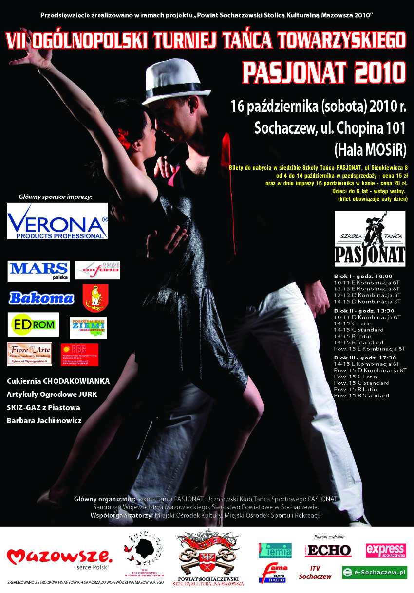 Przedsięwzięcie realizowane w ramach projektu „Powiat Sochaczewski Stolicą Kulturalną Mazowsza 2010”VII OGÓLNOPOLSKI TURNIEJ TAŃCA TOWARZYSKIEGOPASJONAT 201016 października (sobota) 2010 r.Sochaczew, ul. Chopina 101 (Hala MOSiR)Główny organizator:Szkoła Tańca PASJONATUczniowski Klub Tańca Sportowego PASJONATSamorząd Województwa MazowieckiegoStarostwo Powiatowe w Sochaczewie Współorganizatorzy:Miejski Ośrodek KulturyMiejski Ośrodek Sportu i RekreacjiProgramBlok I - godz. 10:00 10-11 E Kombinacja 6T 12-13 E Kombinacja 8T 12-13 D Kombinacja 8T 14-15 D Kombinacja 8T Blok II - godz. 13:30 10-11 D Kombinacja 6T 14-15 C Latin 14-15 C Standard 14-15 B Latin 14-15 B Standard Pow. 15 E Kombinacja 8T Blok III - godz. 17:30 14-15 E Kombinacja 8T Pow. 15 D Kombinacja 8T Pow. 15 C Latin Pow. 15 C Standard Pow. 15 B Latin Pow. 15 B Standard Zmagania taneczne oceniać będą sędziowie:Waldemar Sakowski -...