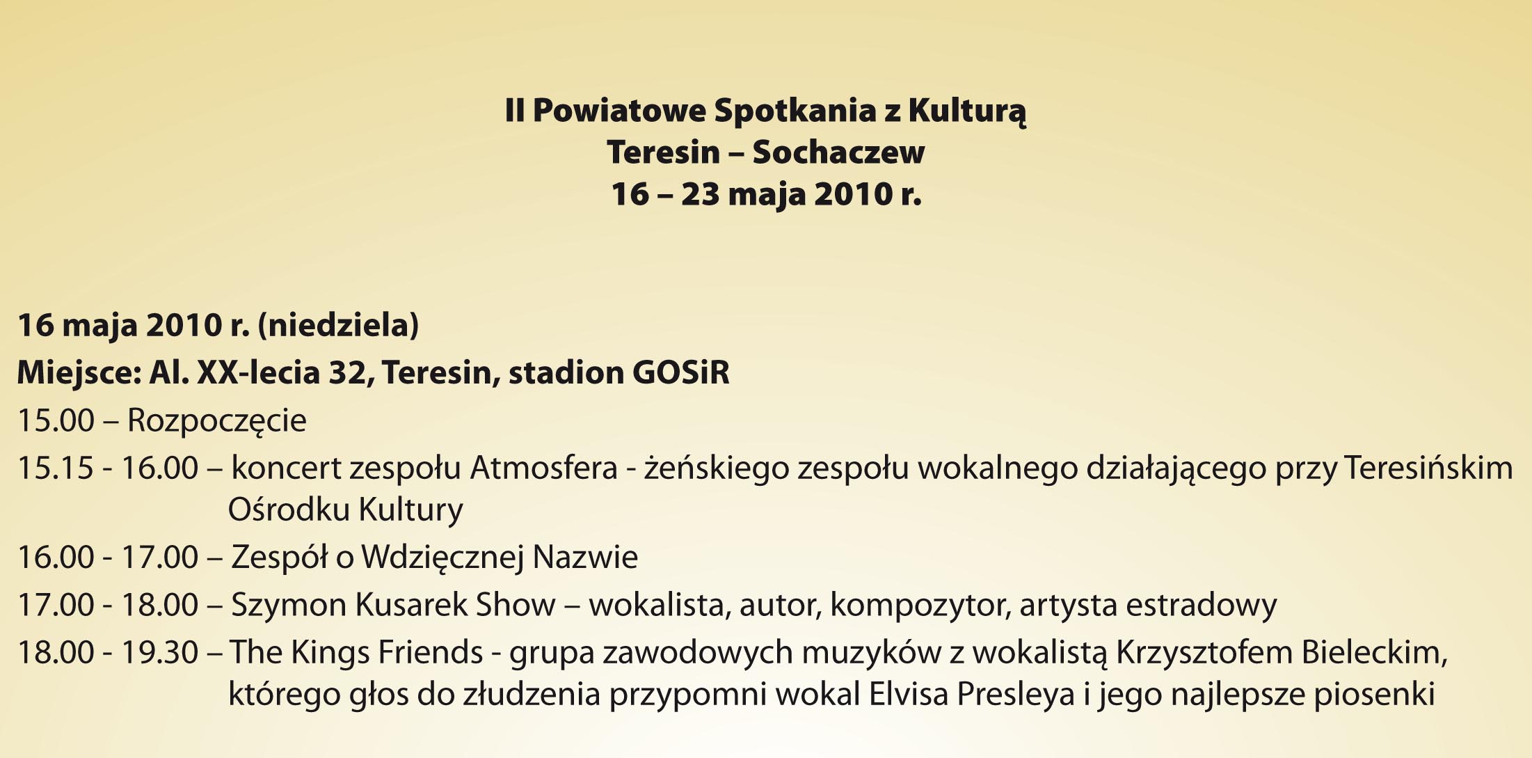 Już w najbliższą niedzielę zapraszamy na II Powiatowe Spotkania z Kulturą organizowane przez Starostwo Powiatowe w Sochaczewie i Teresiński Ośrodek Kultury w ramach projektu 'Powiat Sochaczewski Stolicą Kulturalną Mazowsza 2010'. Zapraszamy do TeresiniaPROGRAM 16 maja 2010 r. (niedziela)Miejsce: al. XX-lecia 32, teren GOSiR 15.00 - Rozpoczęcie15.15 - 16.00 -Koncert zespołu Atmosfera - żeńskiego zespołu wokalnego działającego przy Teresińskim Ośrodku Kultury16.00 - 17.00 Zespół o Wdzięcznej Nazwie17.00 - 18.00 Szymon Kusarek Show – wokalista, autor, kompozytor, artysta estradowy 18.00 - 19.30 The Kings Friends - grupa zawodowych muzyków z wokalistą Krzysztofem Bieleckim, którego głos do złudzenia przypomni wokal Elvisa Presleya i jego najlepsze piosenkiWstęp wolny