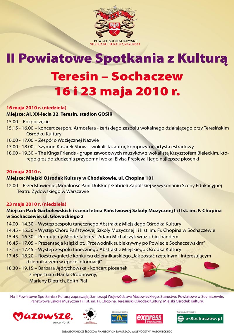 Już po raz drugi zapraszamy Państwa do udziału w Powiatowych Spotkaniach z Kulturą, tym razem do Teresina i Sochaczewa - 16, 20 i 23 maja. Impreza organizowana jest w ramach projektu "Powiat SOchaczewski Stolicą Kulturalną Mazowsza 2010". 16 maja w niedzielę zapraszamy na teren GOSiR-u (boisko) al. XX-lecia 32 do Teresina w godzinach 15.00-19.30, natomiast 23 maja zapraszamy w godzinach 14.00-19.15 do Parku Garbolewskich i Państwowej Szkoły Muzycznej, gdzie na scenie letniej zaplanowano występy artystów. Zaś 20 maja zapraszamy o godz. 12.00 na przedstawienie „Moralność Pani Dulskiej” Gabrieli Zapolskiej w wykonaniu Sceny Edukacyjnej Teatru Żydowskiego w Warszawie. Wstęp na wszystkie imprezy jest bezpłatny.