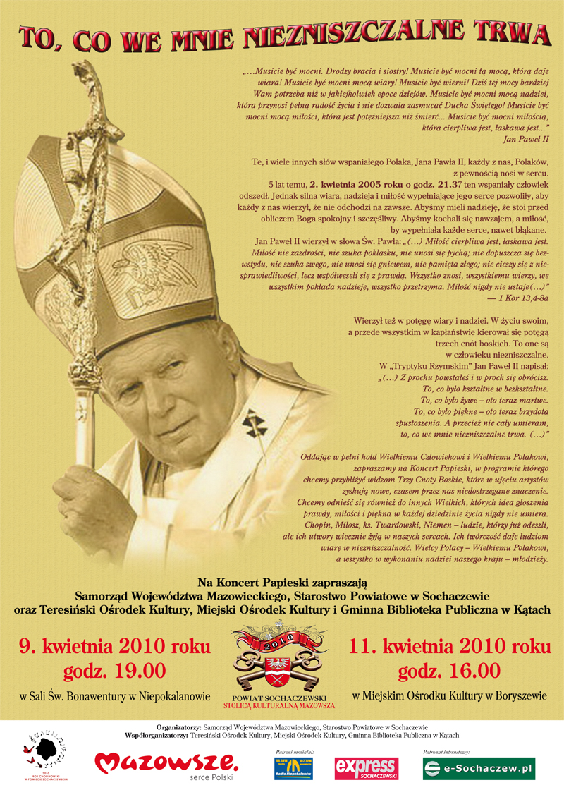 W ramach realizowanego projektu Powiat Sochaczewski Stolicą Kulturalną Mazowsza 2010 zapraszamy wszystkich na Koncert Papieski - TO, CO WE MNIE NIEZNISZCZALNE TRWA.Oddając w pełni hołd Wielkiemu Człowiekowi i Wielkiemu Polakowi, zapraszamy na Koncert Papieski, w programie którego chcemy przybliżyć widzom Trzy Cnoty Boskie, które w ujęciu artystów zyskują nowe, czasem przez nas niedostrzegane znaczenie. Chcemy odnieść się również do innych Wielkich, których idea głoszenia prawdy, miłości i piękna w każdej dziedzinie życia nigdy nie umiera. Chopin, Miłosz, ks. Twardowski, Niemen – ludzie, którzy już odeszli, ale ich utwory wiecznie żyją w naszych sercach. Ich twórczość daje ludziom wiarę w niezniszczalność. Wielcy Polacy – Wielkiemu Polakowi, a wszystko w wykonaniu nadziei naszego kraju – młodzieży. KON...