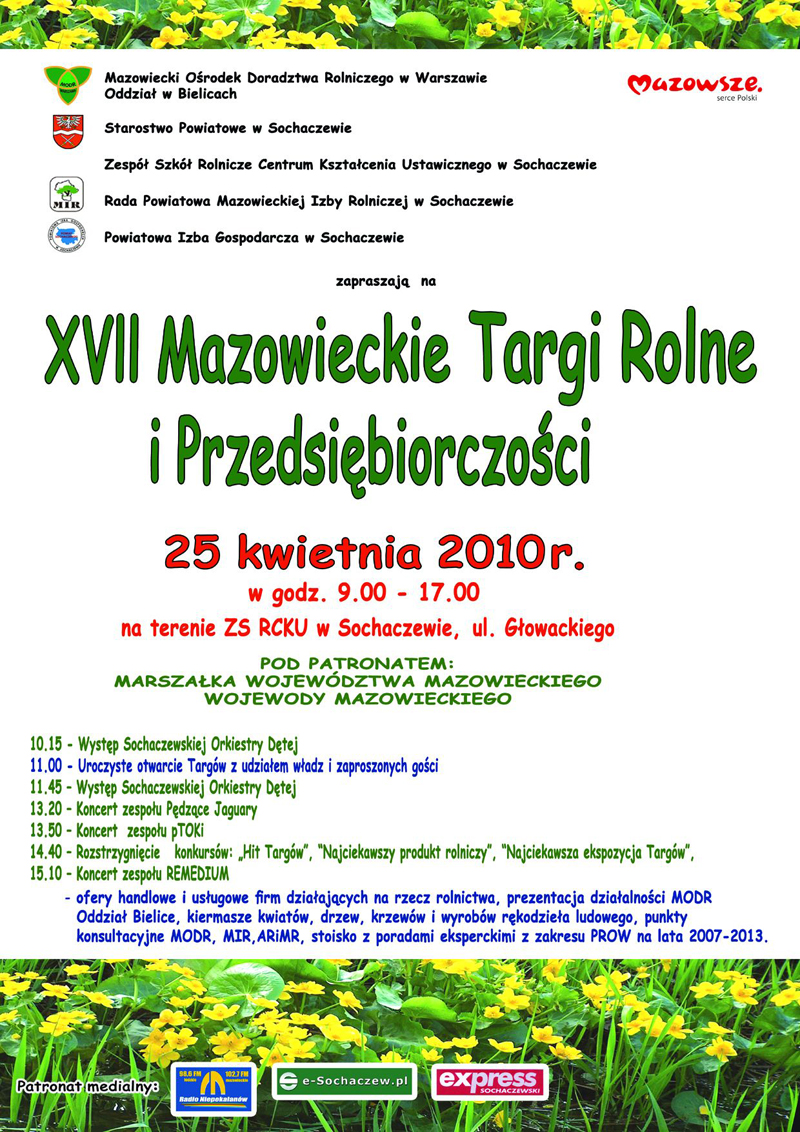 Mazowiecki Ośrodek Doradztwa Rolniczego w Warszawie Oddział w Bielicach, Starostwo Powiatowe w Sochaczewie, Zespół Szkół Rolnicze Centrum Kształcenia Ustawicznego w Sochaczewie, Rada Powiatowa Mazowieckiej Izby Rolniczej w Sochaczewie, Powiatowa Izba Gospodarcza w Sochaczewie zapraszają 25. kwietnia (niedziela) 2010 r. w godz. 9.00-17.00 na XVII Mazowieckie Targi Rolne i PrzedsiębiorczościTargi odbędą się na terenie Gospodarstwa Pomocniczego przy ZS RCKU przy ul. Głowackiego w Sochaczewie. Jak co roku firmy z branż rolniczej, ogrodniczej, spożywczej zaprezentują swe produkty. Organizatorzy spodziewają się ok. 100 wystawców z całego Mazowsza. W poprzednich edycjach targów zwiedzało je kilkanaście tysięcy osób. Impreza rozwija się, cieszy się popularnością wśród wystawców, instytucji i zwiedzających. Przez 16 lat promujemy rodzimych, mazowi...