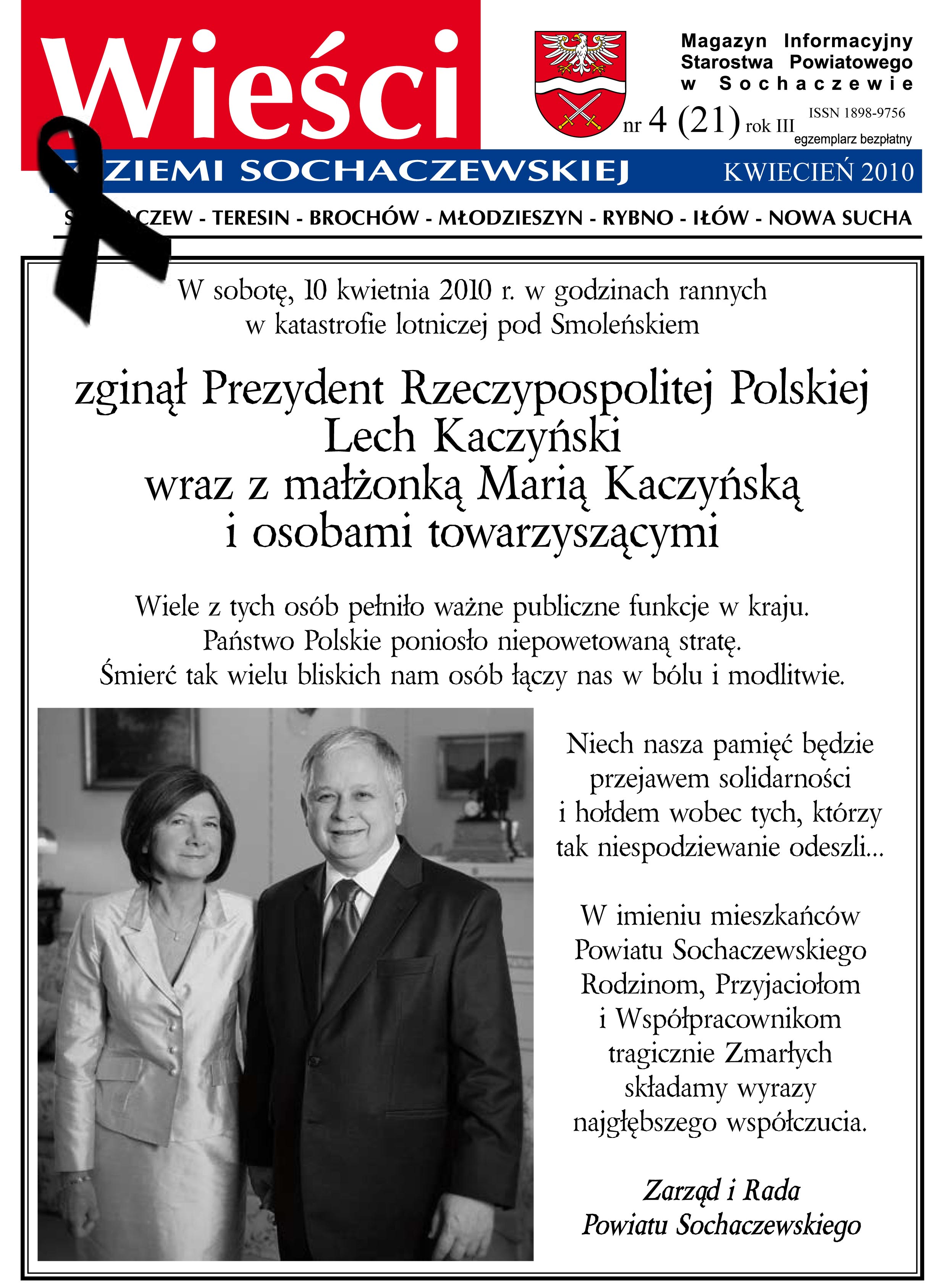 Zapraszamy do lektury najnowszego wydania „Wieści z Ziemi Sochaczewskiej”. Nawiązując do tragedii w Smoleńsku przedstawiamy Państwu fotorelację z Katynia, zdjęcia wykonał i udostępnił nam komendant Hufca ZHP w Sochaczewie Krzysztof Wasilewski. W kwietniowym numerze znajdą też Państwo informację o przeniesieniu do głównego budynku Starostwa Wydziału Komunikacji i Transportu, prezentujemy zdjęcia nowego wydziału. Ponadto, w biuletynie relacja z gali Ośmiu Wspaniałych i wywiad z laureatką konkursu, zaproszenie na Targi Rolne i Przedsiębiorczości oraz koncert w rocznice chrztu Fryderyka Chopina, wieści z gmin i relacja zdjęciowa z uroczystości z okazji jubileuszu 40-lecia 61 i 63. Dywizjonu rakietowego Obrony Powietrznej w Bielicach.*****Dokładnie dwa lata temu, w „Wieściach...” ukazał się materiał i zdjęcia z uroczysto"...