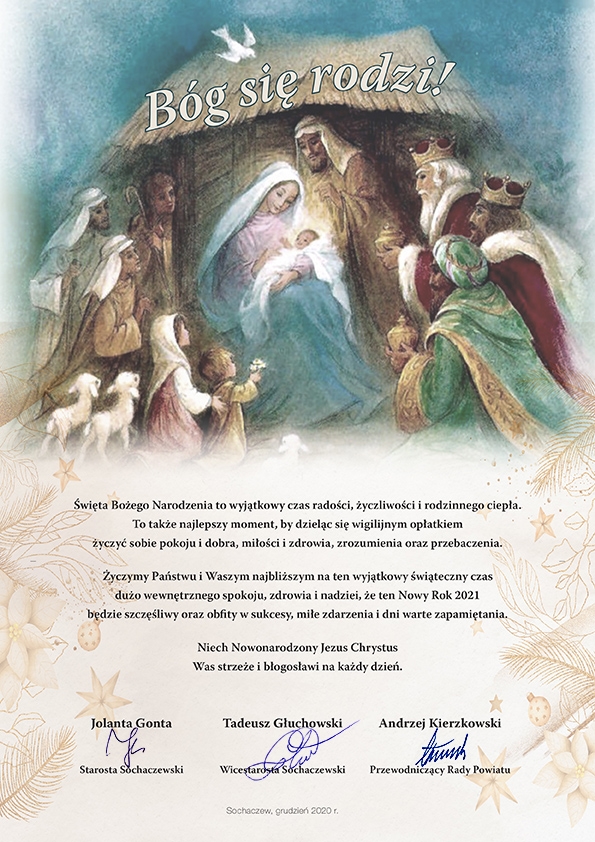 Starosta sochaczewski Jolanta Gonta wraz z wicestarostą Tadeuszem Głuchowski oraz Przewodniczącym Rady Powiatu Andrzejem Kierzkowskim składa wszystkim najserdeczniejsze życzenia bożonarodzeniowe oraz noworoczne!