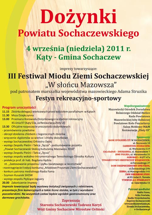 Już w najbliższą niedzielę starosta sochaczewski Tadeusz Koryś i wójt Gminy Sochaczew Mirosław Orliński zapraszają na Dożynki Powiatowe, które w tym roku odbędą się w Kątach.Imprezami towarzyszącymi będą III Festiwal Miodu Ziemi Sochaczewskiej „W słońcu Mazowsza” oraz festyn rekreacyjno-sportowy. Wszystko to na stadionie rekreacyjnym w Kątach (na tyłach salonu meblowego M&M Kąty i restauracji Złoty Ul). Impreza poprzedzona zostanie Mszą św. odprawioną w kościele parafialnym w Kątach.Dożynki Powiatu Sochaczewskiego tym razem samorząd powiatowy organizuje wspólnie z gminą Sochaczew. Tegorocznymi starostami dożynkowymi będą Elżbieta Grabowska ze wsi Żdżarów oraz Sławomir Lachowicz ze wsi Zalesie Dąbki. Wieniec dożynkowy wykona Irena Antuszewicz z miejscowości Janaszówek. ...