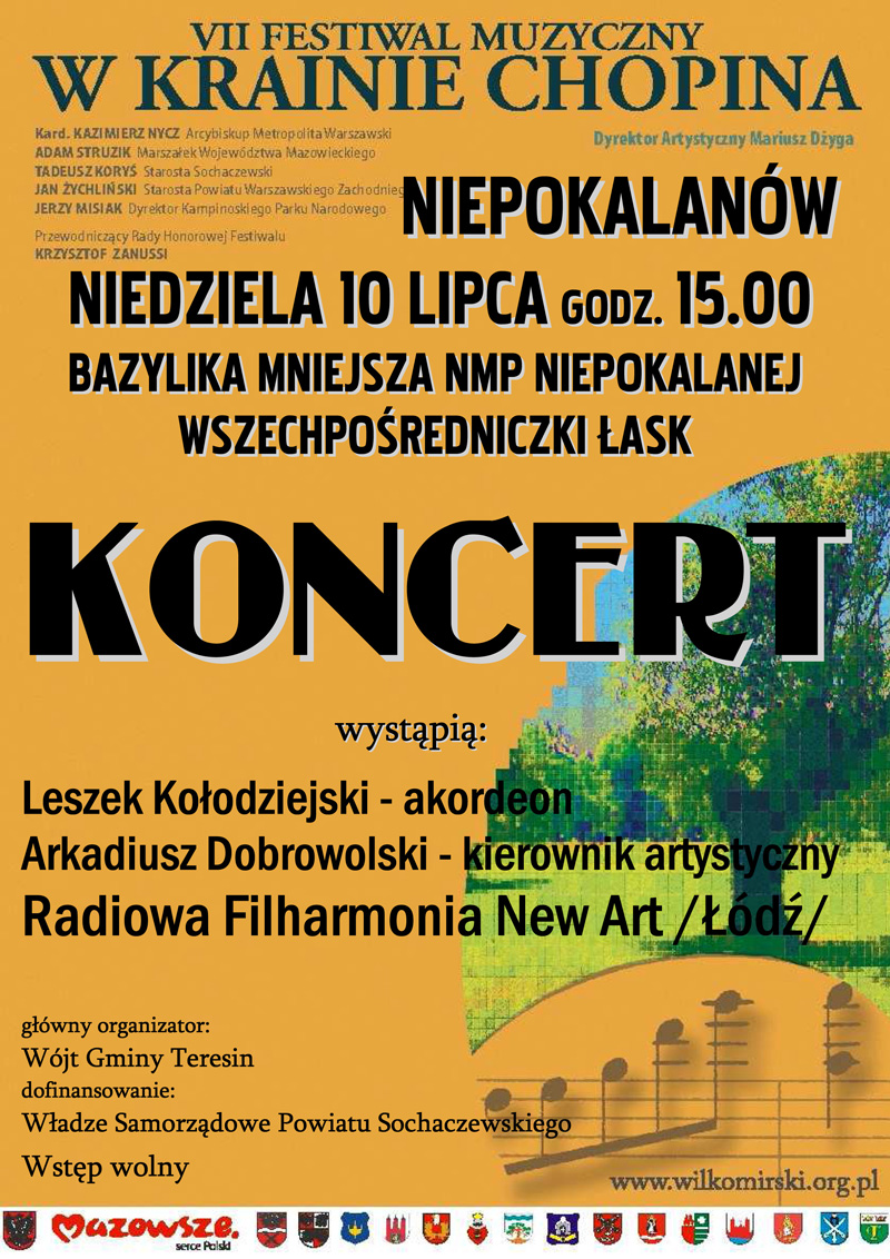 W najbliższą niedzielę, 10 lipca w ramach projektu VII Festiwalu Muzycznego „W Krainie Chopina” w Bazylice Mniejszej NMP w Niepokalanowie o godz. 15.00 odbędzie się koncert muzyczny w wykonaniu: Leszka Kołodziejskiego – akordeon, Arkadiusza Dobrowolskiego - kierownik artystyczny oraz Radiowej Filharmonii New Art z Łodzi. Organizatorami koncertu jest: Wójt Gminy Teresin, Teresiński Ośrodek Kultury, Klasztor o.o. Franciszkanów w Niepokalanowie oraz Towarzystwo Muzyczne im. Kazimierza Wiłkomirskiego w Starych Babicach. Koncert dofinansowany został również ze środków Starostwa Powiatowego w Sochaczewie.- Zapraszam gorąco wszystkich mieszkańców powiatu sochaczewskiego i nie tylko na ten wyjątkowy i niepowtarzalny koncert do niepokalanowskiej Bazyli w najbliższą niedzielę – zaprasza starosta Tadeusz Koryś.Wstęp wolny.Zapraszamy