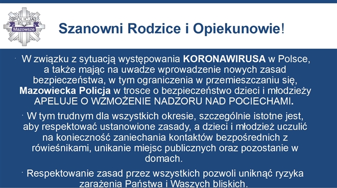 Przypominamy, że rozporządzenie Ministra Zdrowia z dnia 24 marca 2020 roku wprowadza ograniczenia w przemieszkaniu się, poza celami bytowymi, zdrowotnymi, zawodowymi. Pamiętajmy w tym trudnym czasie, że przepisy są wp...