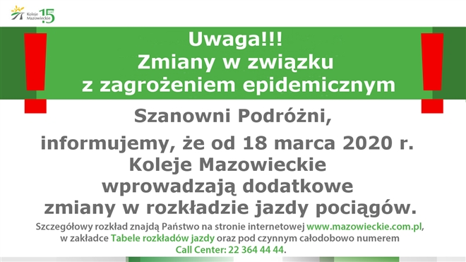 Ze względu na panującą sytuację związaną z zagrożeniem epidemicznym Koleje Mazowieckie wprowadzają dodatkowe zmiany w rozkładzie jazdy pociągów. Szczegółowe informacje na stronie internetowej www.mazowie...