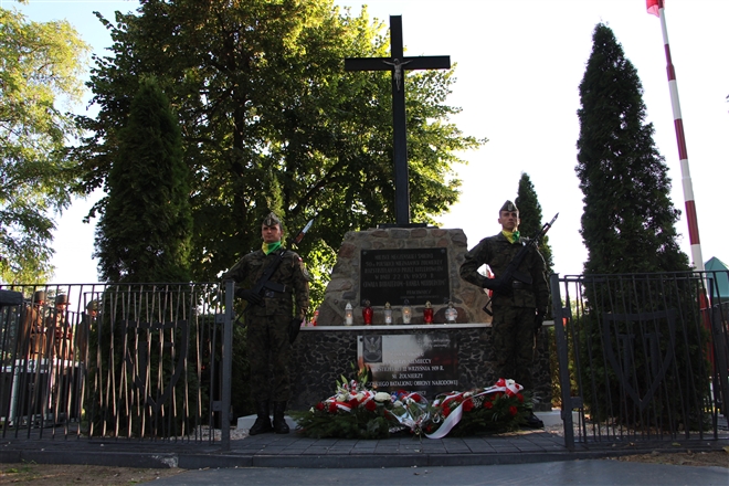W 80. rocznicę rozstrzelania przez Niemców 50 żołnierzy Bydgoskiego Batalionu Obrony Narodowej władze samorządowe, kapłani, wojsko, policja, straż pożarna, kombatanci, dzieci, młodzież i mieszkańcy powiatu odda...