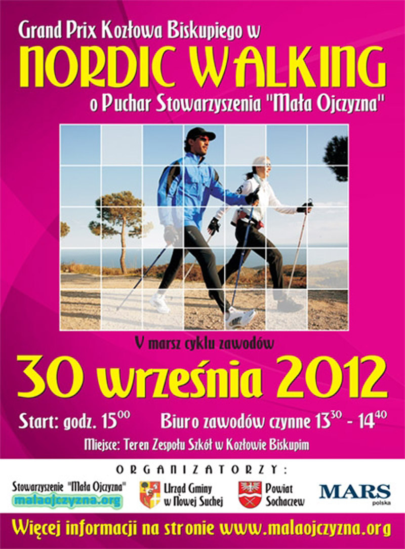 Stowarzyszenie „Mała Ojczyzna „ serdecznie zaprasza wszystkich chodzących z kijami na V już Marsz Cyklu Grand Prix Kozłowa Biskupiego w Nordic Walking o Puchar Stowarzyszenia „Mała Ojczyzna” który odbędzie się 30 września 2012 o godzinie 15:00 na terenie Zespołu Szkól w Kozłowie Biskupim. Zapisy w Biurze Zawodów w dniu imprezy od 13::30 do 14:40.Serdecznie zapraszamy również początkujących”kijkarzy” , pół godziny przed startem mistrz PolskiJózef Maciej Brzezina przypomina zasady i technikę nordic walkingu.Przypominamy , że zawodnicy którzy choć raz startowali w którymś z zawodów cyklu mają jeszcze szanse by włączyć się do rywalizacji pucharowej.Po zawodach odbędzie się losowanie nagród wśród wszystkich uczestników V marszu.Jeszcze raz serdecznie zapraszamy do rywalizacji sportowej...