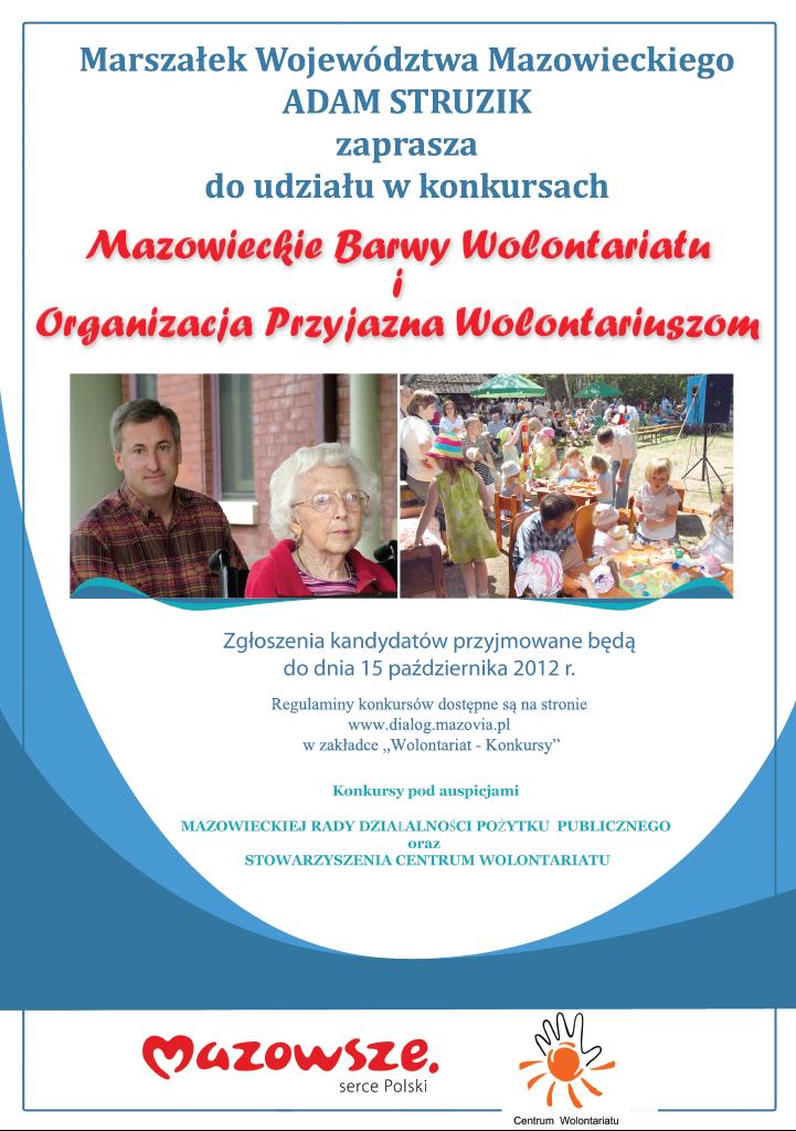 Urząd Marszałkowski Województwa Mazowieckiego we współpracy z Mazowieckim Urzędem Wojewódzkim pod auspicjami Mazowieckiej Rady Działalności Pożytku Publicznego i Stowarzyszenia Centrum Wolontariatu w Warszawie organizują konkursy pn. „Mazowieckie Barwy Wolontariatu” oraz „Organizacja Przyjazna Wolontariuszom”. Konkursy te są etapem wojewódzkim ogólnopolskiego konkursu, którego realizatorem jest Sieć Centrów Wolontariatu w Polsce, reprezentowana na terenie województwa mazowieckiego przez Stowarzyszenie Centrum Wolontariatu w Warszawie.W imieniu Marszałka Województwa Mazowieckiego Adama Struzika, który objął honorowy patronat nad konkursami, serdecznie zapraszamy do udziału.1) Mazowieckie Barwy Wolontariatu W ramach Konkursu w województwie mazowieckim zostaną wyłonieni laureaci lokalni, którzy wezmą udział w finale ogólnopolskim ...