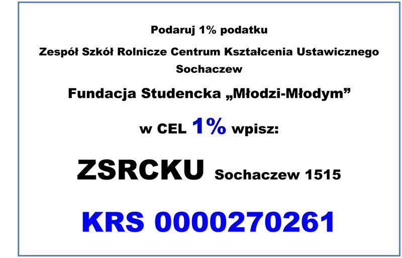 Czy wiecie, że wypełniając PIT sami możecie zdecydować, na jakie cele mają być przeznaczone Wasze podatki? Jeżeli chcecie zrobić coś dobrego, przekażcie 1% podatku dla Zespołu Szkół Rolnicze Centrum Kształcenia Ustawicznego Sochaczew - Fundacji Studenckiej „Młodzi Młodym”.Wypełniając za rok PIT 2012 nie pozwólcie, by inni zadecydowali za Was. Sami zdecydujcie, co stanie się z częścią Waszych pieniędzy, które i tak musicie oddać do państwa.Poprzez przekazanie podatku naszej Fundacji Studenckiej „Młodzi-Młodym”, wesprzecie działalność młodych ludzi. Przekazując 1% podatku dajecie wychowankom nadzieję na spełnienie. Każda, nawet najmniejsza kwota jest ogromnym wsparciem. Przekazanie podatku doskonale udowadnia, że czasami wystarczy naprawdę niewiele, by uczynić coś wyjątko...