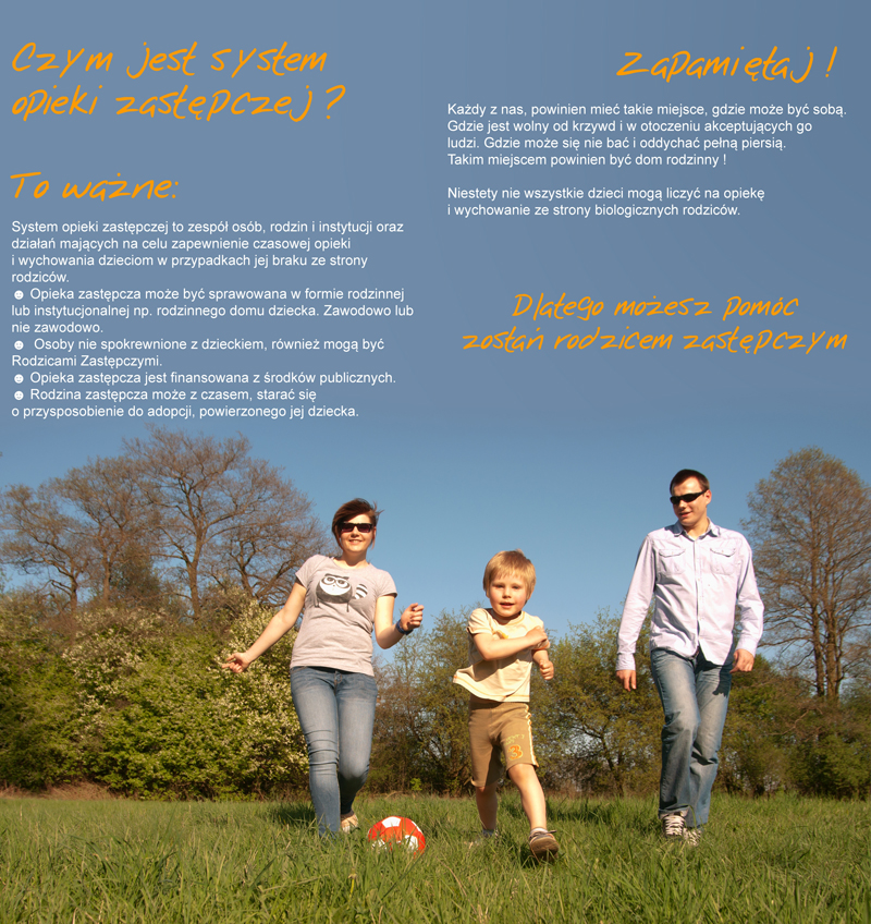 Czym jest system opieki zastępczej?System opieki zastępczej to zespół osób, rodzin i instytucji oraz działań mających na celu zapewnienie czasowej opieki i wychowania dzieciom w przypadkach jej braku ze strony rodziców.Opieka zastępcza może być sprawowana w formie rodzinnej lub instytucjonalnej np. rodzinnego domu dziecka. Zawodowo lub nie.Osoby nie spokrewnione z dzieckiem również mogą być Rodzicami Zastępczymi.Opieka zastępcza jest finansowa ze środków publicznych.Rodzina zastępcza może z czasem stać się o przysposobienie do adopcji powierzonego jej dziecka.ZapamiętajKażdy z nas powinien mieć takie miejsce, gdzie może być sobą. Gdzie jest wolny od krzywd i w otoczeniu akceptujących go ludzi. Gdzie może się nie bać i oddychać pełną piersią. Takim miejscem powinien być dom rodzinny.Niestety nie wszystkie dzieci mo...
