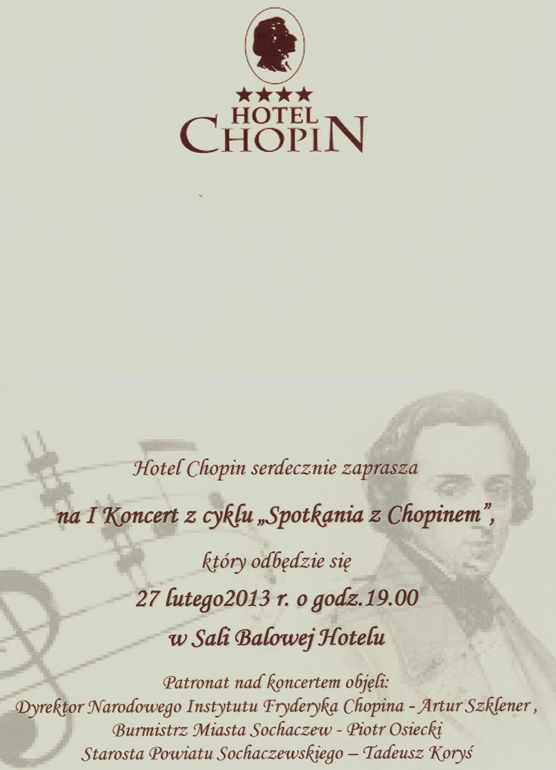 Hotel Chopin zaprasza dziś (w środę) o godz. 19.00 do sali balowej na I Koncert z cyklu „Spotkania z Chopinem”.Jak zapowiadają organizatorzy to pierwszy z zaplanowanych ośmiu koncertów związanych z twórczością naszego znakomitego kompozytora Fryderyka Chopina.W programie spotkania będą mogli Państwo wysłuchać koncertu fortepianowego. Odczytane zostaną także wybrane listy Chopina.Patronat nad dzisiejszym koncertem objęli: dyrektor Narodowego Instytutu Fryderyka Chopina – Artur Szklener, starosta sochaczewski Tadeusz Koryś i burmistrz Sochaczewa Piotr Osiecki.Wstęp na koncert jest wolny.