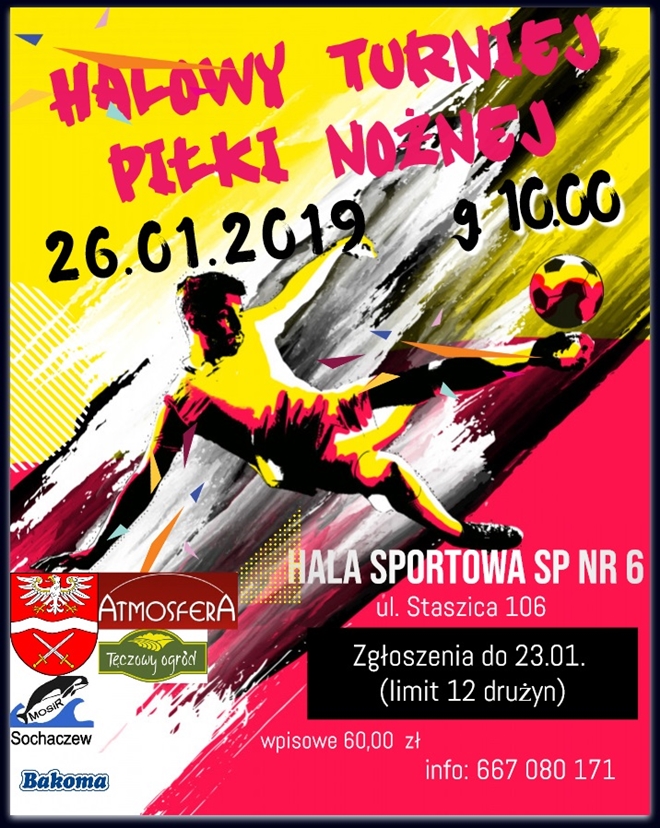 Zapraszamy do wzięcia udziału w Halowym Turnieju Piłki Nożnej, który rozegrany zostanie 26 stycznia (sobota) w hali sportowej Szkoły Podstawowej nr 6 przy ul. Staszica 106. Start godz.10.00. Głównymi spo...