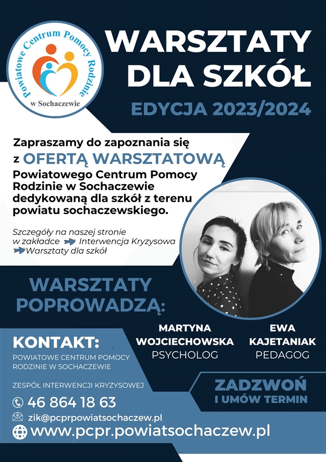 Zachęcamy szkoły do zapoznania się z ofertą Powiatowego Centrum Pomocy Rodzinie. Oferta warsztatowa na nowy rok szkolny 2023-2024. Zajęcia poprowadzą Martyna Wojciechowska - psycholog oraz Ewa Kajetaniak - pedagog. ...