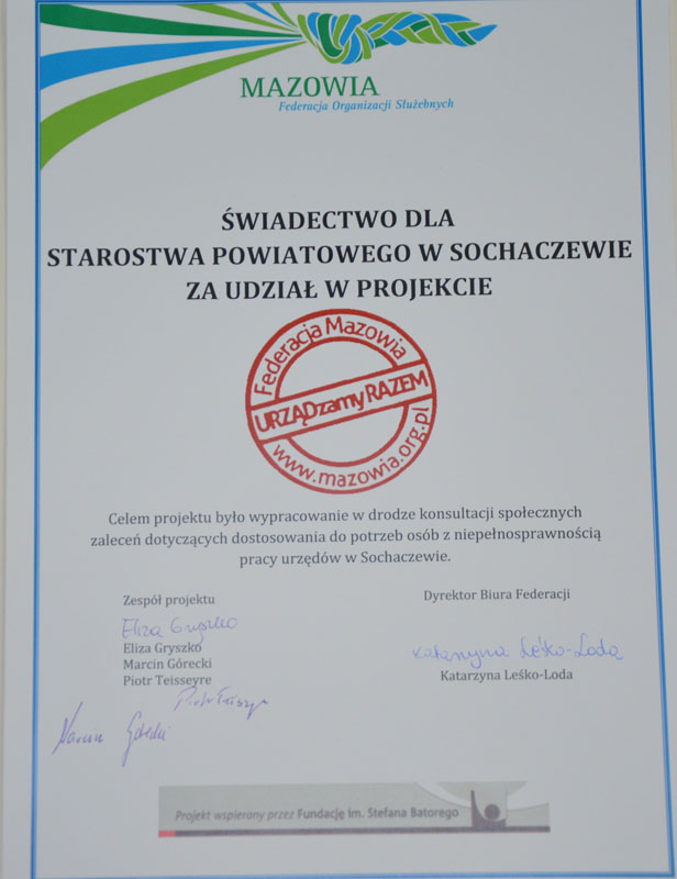 Starostwo Powiatowe w Sochaczewie w sierpniu otrzymało list z podziękowaniem za udział w projekcie organizowanym przez Federacje Organizacji Służebnych Mazowia pn. ,, Mazowia” – URZĄDzamy RAZEM. Sochaczew był trzecim w kolejności miastem, w którym zostały zrealizowane działania partycypacyjne. Na przełomie 2011 i 2012 roku, również w Mińsku Mazowieckim oraz w pierwszej połowie 2012 roku, w Grójcu - odbyły się konsultacje społeczne z udziałem osób niepełnosprawnych i urzędników. Projekt URZĄDzamy RAZEM to projekt realizowany na Mazowszu: w trzech miastach -siedzibach powiatu. Początkowe działania zostały rozpoczęte w Mińsku Mazowieckim w listopadzie 2011 r. w pierwszej połowie 2012 r. objęło Grójec, a w drugiej połowie roku dotarło do Sochaczewa. Celem projektu było wypracowanie, w drodze konsultacji ...