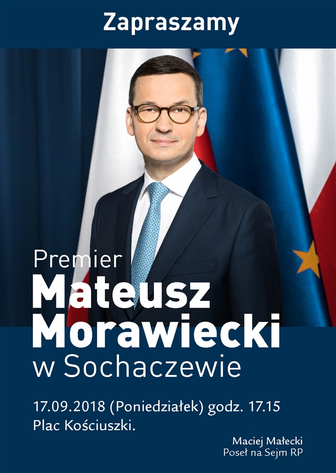 Dziś, 17 września, na zaproszenie posła Macieja Małeckiego, do Sochaczewa przyjedzie Premier RP Mateusz Morawiecki. Spotkanie z mieszkańcami powiatu odbędzie się w Sochaczewie na Placu Kościuszki. Początek o godz. 17.15.