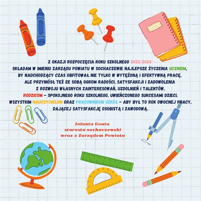 Z okazji rozpoczęcia roku szkolnego 2023/2024 składam w imieniu Zarządu Powiatu w Sochaczewie najlepsze życzenia Uczniom, by nadchodzący czas obfitował nie tylko w wytężoną i efektywną pracę, ale przyniósł też ...