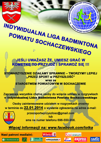 Stowarzyszenie „Działamy Sprawnie – Tworzymy Lepiej – Przez sport w przyszłość” oraz Starostwo Powiatowe w Sochaczewie zachęcają do udział w tworzącej się właśnie Indywidualnej Lidze Badmintona na terenie powiatu sochaczewskiego.Zebranie organizacyjne dla wszystkich osób zainteresowanych udziałem w niej odbędzie się w czwartek, 23 stycznia o godz. 18.00 w sali konferencyjnej Starostwa Powiatowego w Sochaczewie, ul. J. Piłsudskiego 65.W razie dodatkowych pytań prosimy o kontakt telefoniczny: 696-550-956 lub e-mail: przezsportwprzyszlosc@gmail.com