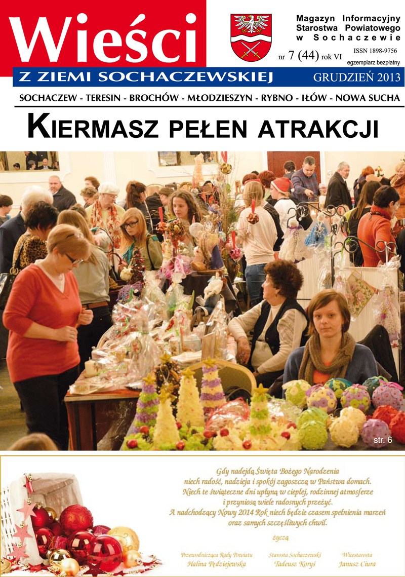 Ukazało się grudniowe 44 wydanie magazynu informacyjnego Starostwa Powiatowego w Sochaczewie „Wieści z Ziemi Sochaczewskiej”. Przeczytają państwo materiał o inwestycjach drogowych realizowanych przez Powiatowy Zarząd Dróg. Zamieszczamy relację z II kiermaszu bożonarodzeniowego, który odbył się w niedzielę 15 grudnia w Sochaczewie. Opisujemy przebieg debaty społecznej dotyczącej bezpieczeństwa w powiecie sochaczewskim. Przedstawiamy ludzi kultury, których działania docenił również starosta sochaczewski Tadeusz Koryś. Dużo miejsca na stronach biuletynu poświęcamy pomocy społecznej. Relacjonujemy uroczystość, podczas której odbyło się podsumowanie projektu „Czas na samodzielność”, realizowanego przez Powiatowe Centrum Pomocy Rodzinie, opisujemy pierwszą wigilię zorganizowaną wspólnie przez PCPR i S...