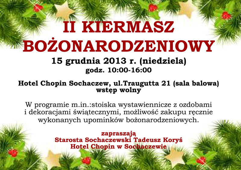 W niedzielę 15 grudnia br. odbędzie się II Kiermasz Bożonarodzeniowy organizowany przez Starostwo Powiatowe w Sochaczewie oraz Hotel Chopin. Ponad 50 wystawców będzie oferować swoje produkty, wśród których mieszkańcy powiatu sochaczewskiego znajdą szereg upominków, ozdób świątecznych i bożonarodzeniowych przysmaków. Kiermasz potrwa od godz. 10:00 do 16:00 w sali balowej Hotelu Chopin przy ul. Traugutta 21. Wstęp wolny.W ubiegłym roku Kiermasz Bożonarodzeniowy pn. „Boże Narodzenie na Mazowszu” spotkał się z bardzo pozytywnym przyjęciem zarówno przez wystawców, jak i odwiedzających. Druga edycja będzie utrwalać tradycje świąteczne i walory Mazowsza i Ziemi Sochaczewskiej. Będzie doskonałą okazją do zrobienia świątecznych upominków, ponieważ wystawcy zaprezentują zróżnicowany asortymen...