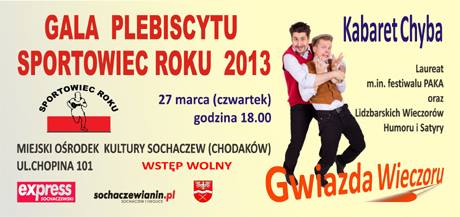 Po raz XII czytelnicy „Expressu Sochaczewskiego” wybierają najpopularniejszego sportowca Sochaczewa i powiatu sochaczewskiego oraz trenera roku. Finał już w czwartek, 27 marca o godzinie 18.00 w sali Miejskiego Ośrodka Kultury w Chodakowie podczas gali plebiscytu Sportowiec Roku. Nie zabraknie także innych atrakcji. Między innymi solidnej dawki humoru, serwowanego przez popularny kabaretu. Już dziś zapraszamy na to wydarzenie. Wstęp bezpłatny.Tylko do 15 marca można głosować w plebiscycie na Sportowca i Trenera Roku 2013. Oddano około 5000 głosów przez sms-y. Przebieg rywalizacji można śledzić na stronie internetowej sochaczewianin.pl. Wszystko jednak może się jeszcze zmienić. Gdyż to głosy na kuponach mogą zaważyć na ostatecznym wyniku. Jest ich obecnie oddanych około 2000. Jako pierwsza wyniki pozna Kapituła Plebiscytu, która zbierze się 1...