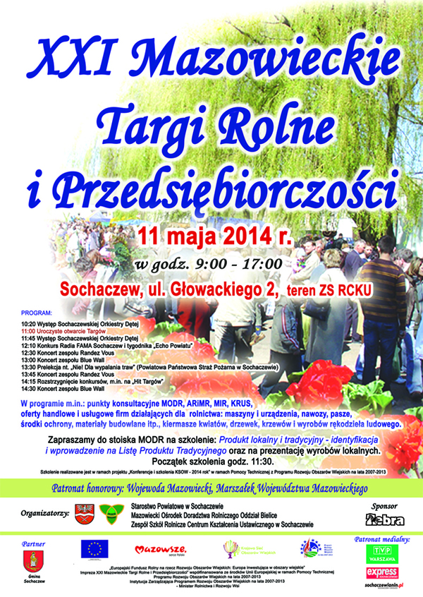 Już po raz XXI Starostwo Powiatowe w Sochaczewie, Mazowiecki Ośrodek Doradztwa Rolniczego – Oddział Bielice oraz Zespół Szkół Rolnicze Centrum Kształcenia Ustawicznego zorganizowali Mazowieckie Targi Rolne i Przedsiębiorczości. Jak co roku odbyły się na terenie gospodarstwa pomocniczego ZS RCKU przy ulicy Głowackiego w Sochaczewie.Targi zainaugurowali Tadeusz Koryś, starosta sochaczewski, Andrzej Kamasa, dyrektor Mazowieckiego Ośrodka Doradztwa Rolniczego, Jacek Kozłowski, wojewoda mazowiecki i w imieniu marszałka Adama Struzika – Mirosław Adam Orliński, radny sejmiku województwa mazowieckiego. W tym roku zaprezentowało swoją ofertę ponad 100 wystawców z branż: rolniczej, ogrodniczej, budowlanej, motoryzacyjnej, środków ochrony roślin, mechanicznej, grzewczej, pszczelarskiej, spożywczej. Były produkty regionalne – tradycyjne wędliny ku...